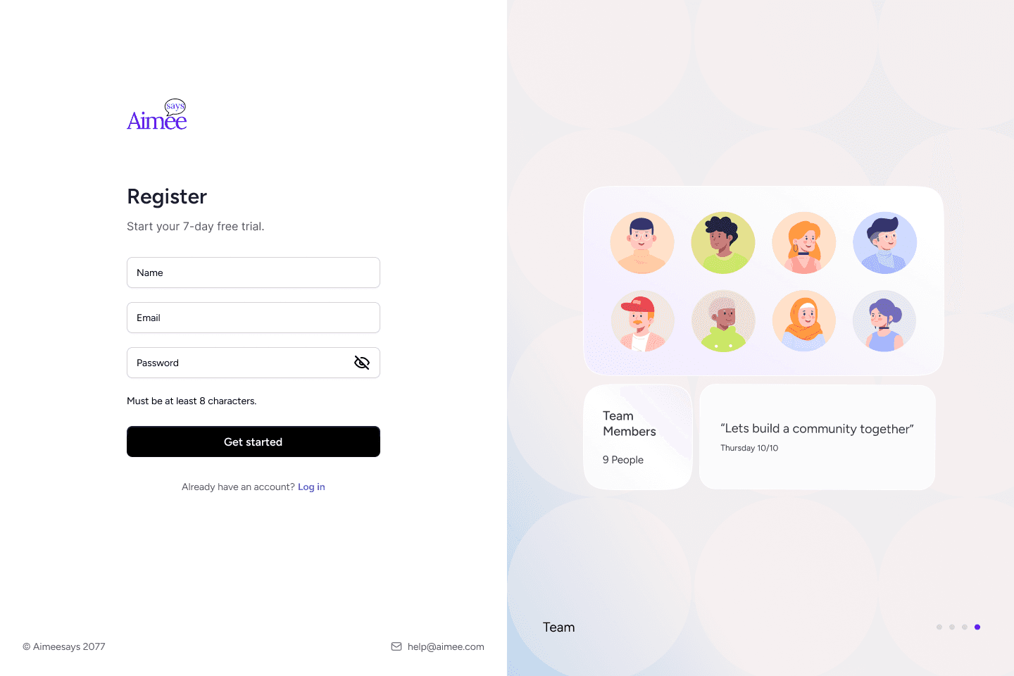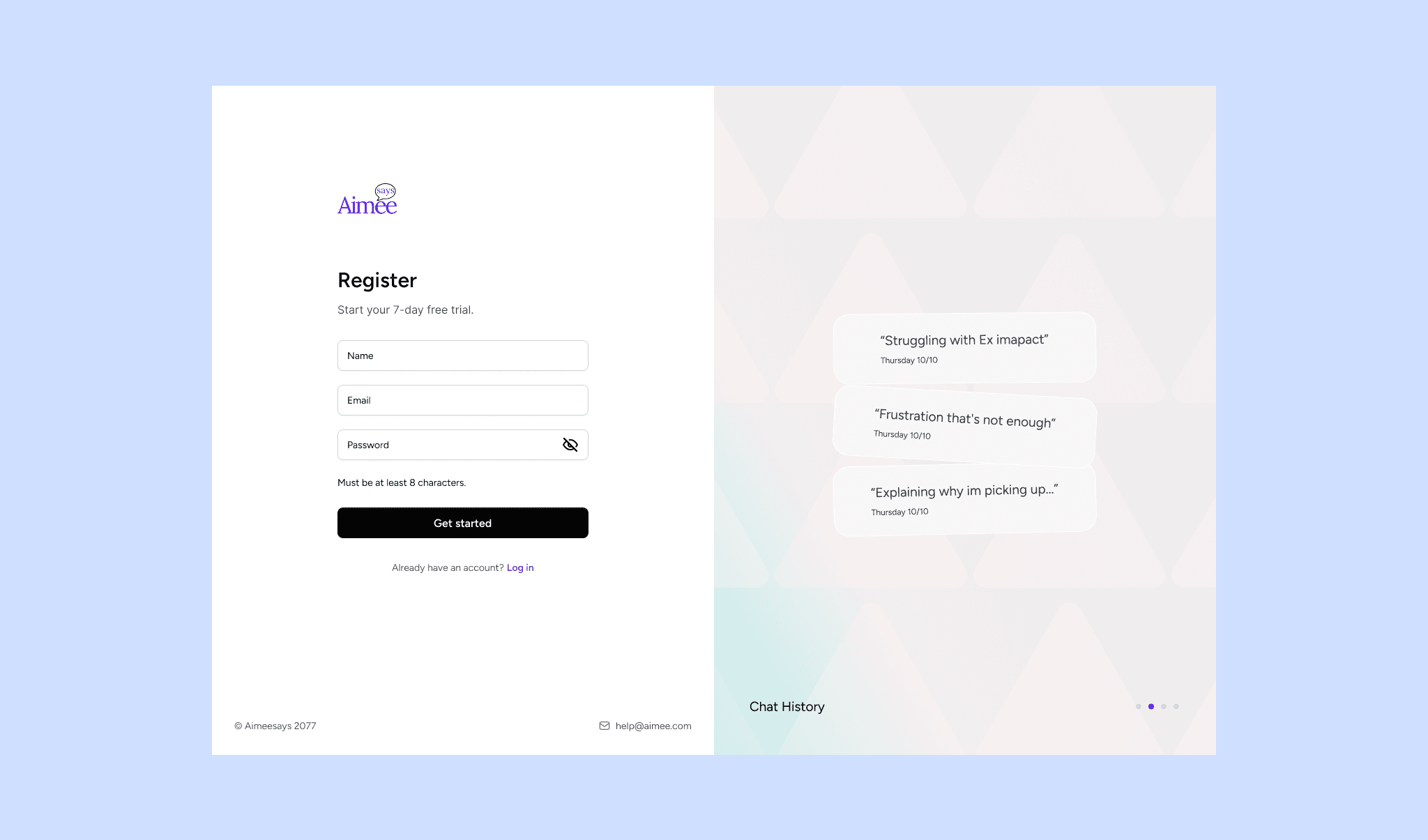 Aimee is a mental health support app designed to assist individuals suffering from PTSD. The app features an AI-driven chat system that provides therapy sessions, coping strategies, and personalized recommendations for calming places to visit to aid in emotional recovery.
